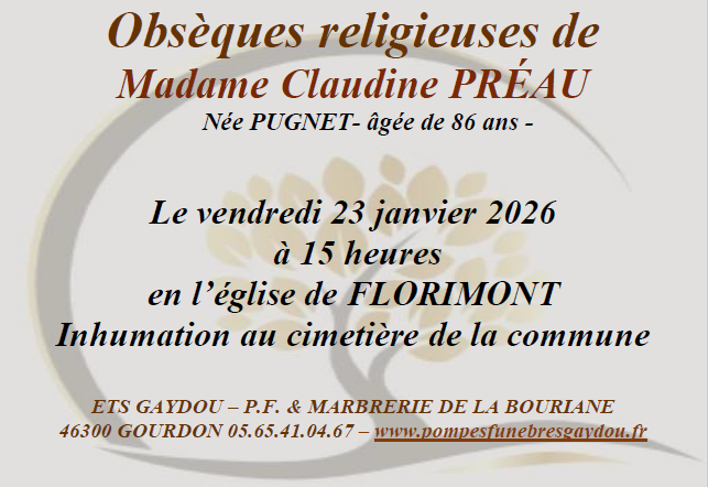 Mme PREAU sera inhumée vendredi 23 janvier à 15h dans l'église de Florimont